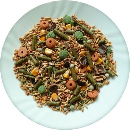 • Zutaten: Vollkornhafer, Weizen, Mais, Gerste, Sorghumhirse, Erbsen, Trockenfutter, Johannisbrot, extrudiertes Getreide