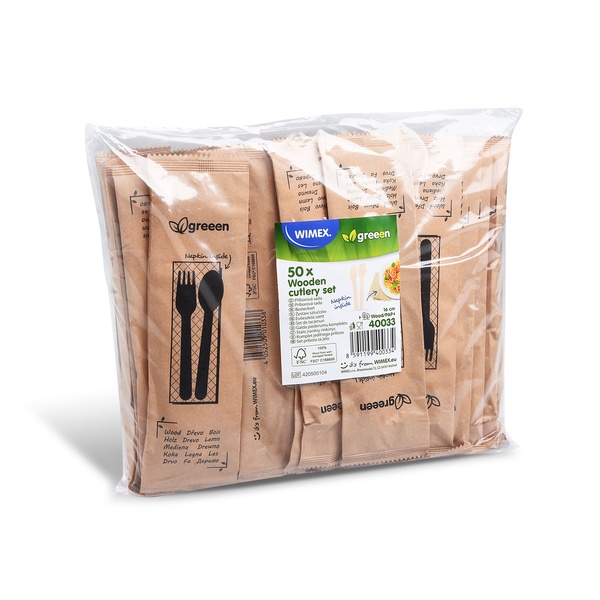 Das Besteck besteht aus unimprägniertem Holzfurnier, ist robust, temperaturbeständig und für den direkten Kontakt mit Lebensmitteln geeignet. Die Serviette ist kompostierbar und hat ein natürliches, ökologisches Aussehen.