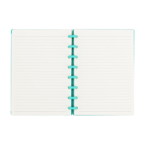 Blok má pevnou obálku z odolného polypropylenu a praktickou kroužkovou vazbu, která usnadňuje otáčení stránek. Uvnitř najdete 80 linkovaných listů vhodných pro psaní, kreslení i poznámky.