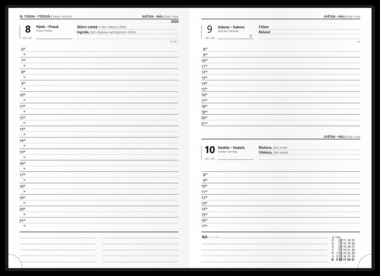 Denní diář formátu A5 je vyráběný z matného hladkého lamina s parciálním lakem, který dodává každému diáři šmrnc. Jedná se nejen o skvělý doplněk, ale také si budete moci efektivněji plánovat Váš čas. tištěná grafika potažená nepoškrabatelným matným laminem s parciálním lakem, jednostranná pěnová výplň desek, šitá vazba V8, stužka, kapitálky, perforované rožky, mapa ČR a SR, vlepená kapsa, ofset, 70g/m2