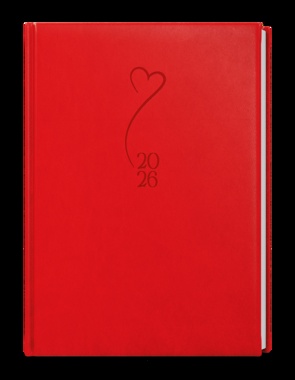 Denní diář A5 vyrobený z měkkého hladkého materiálu v červené barvě s motivem Srdce. Díky formátu a velkému prostoru si můžete efektivně plánovat každý den. jemný hladký materiál, ražba roku, jednostranná pěnová výplň desek, šitá vazba V8, stužka, kapitálky, perforované rožky, mapa ČR a SR, vlepená kapsa, ofset, 70g/m2