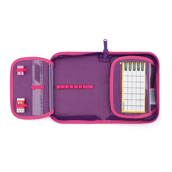 Einlagiges Schulfedermäppchen mit 2 Klappen, leer enthält 25 Gummischlaufen zur Aufbewahrung von Schreibwaren.