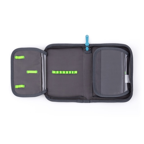 Einstöckiges Schulmäppchen mit 2 Klappen, leer, enthält 25 Gummischlaufen zur Aufnahme von Schreibwaren.