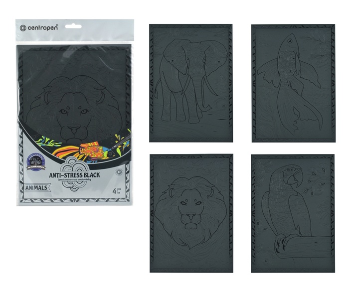 Das Set enthält 4 schwarze A4-Malbücher mit „Tier“-Motiven.