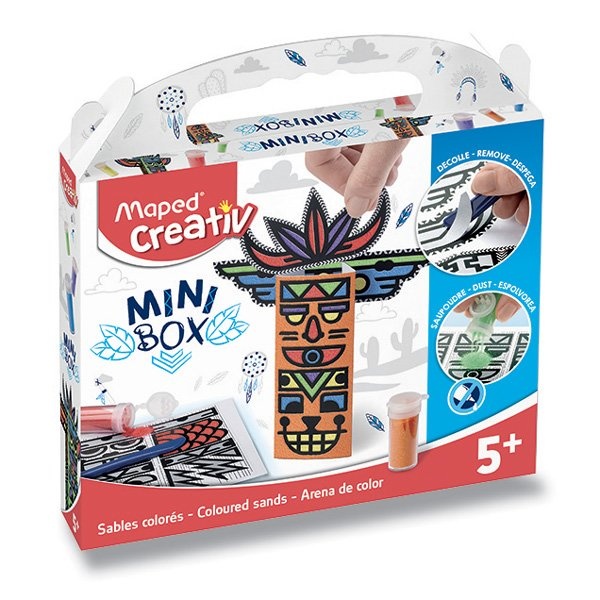 Souprava obsahuje 1 arch na sestavení 2 různých totemů, 6 pískových barev a 1 umělohmotnou špachtli. Pomocí špachtle se sloupne lepicí papír z archu a na dané místo se nasype písková barva k ozdobení totemu, který lze následně snadno sestavit do 3D modelu. Výška totemu 17 cm. Vhodné pro děti od 5 let.