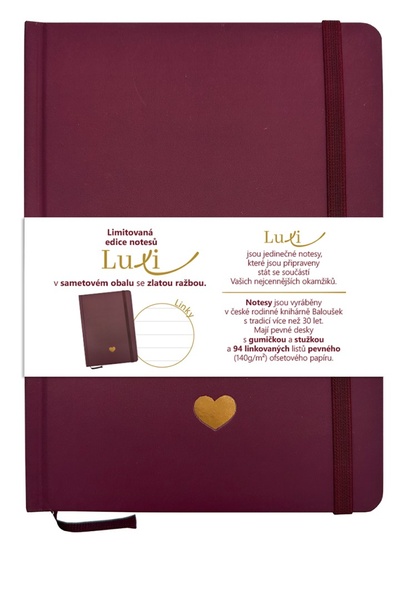 Limitovaná edice linkovaných notesů Luxi se sametovým přebalem v moderní bordó barvě a se zlatým motivem srdce. Elegantní notes se stuhou a gumičkou je ideální…