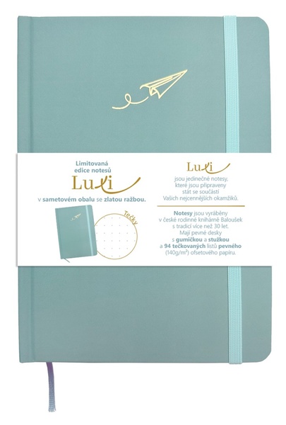 Volltext →Limitovaná edice notesů Luxi s tečkovaným blokem a sametovým přebalem v moderní ledově modré barvě se zlatým motivem vlaštovky. Stylový notes se stuhou a gumič…