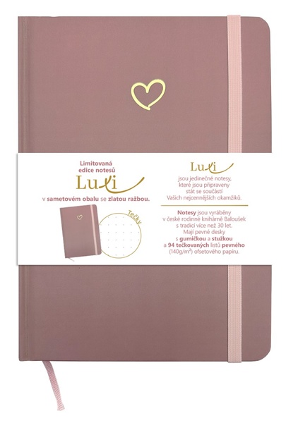 Volltext →Limitovaná edice notesů Luxi s tečkovaným blokem a sametovým přebalem v moderní starorůžové barvě se zlatým motivem srdíčka. Stylový notes se stuhou a gumičkou…