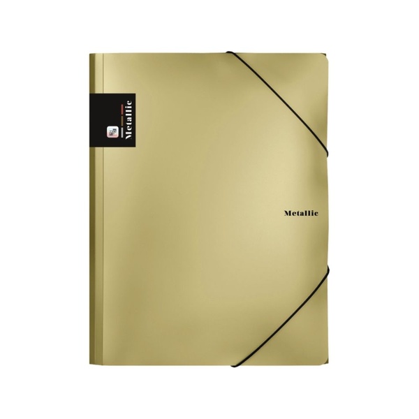 Eine dreifache Mappe in Metallic-Farben mit einem Sicherungsgummi über den Ecken, das verhindert, dass Dokumente herausfallen.