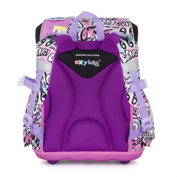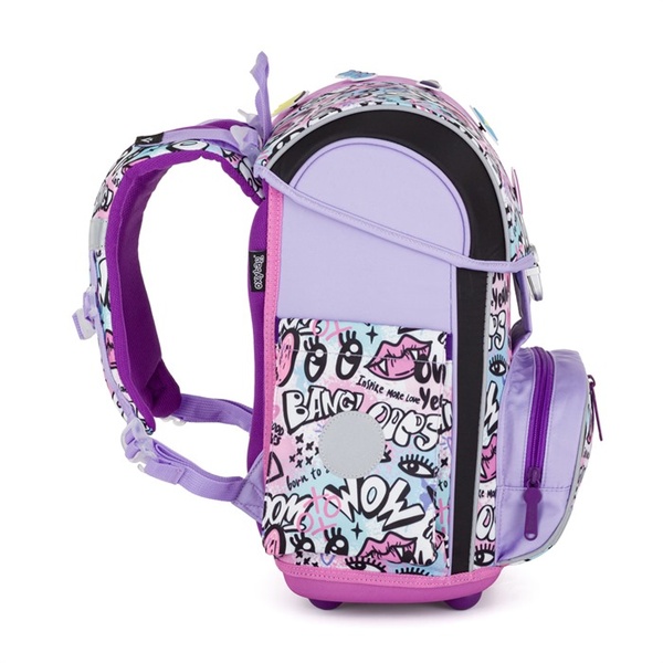 Die verstärkte Rückenpartie und die Innenverstärkung tragen zur Formstabilität des Ranzens bei. Atmungsaktive Polsterung und breite, weiche Schultergurte verteilen das Gewicht gleichmäßig auf den Schultern des Kindes. Der Ranzen ist außerdem mit zusätzlichen Haken zum Anbringen von langen Gurten ausgestattet.