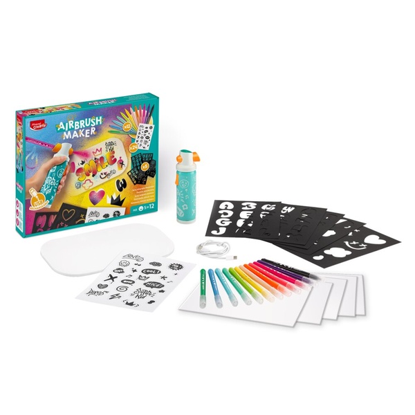 Kreativní sada Maped Creativ AirBrush Maker umožňuje dětem tvořit zářivá a originální umělecká díla pomocí elektronického spreje a fixů Maped Color’Peps Jungle. Díky šablonám a samolepkám mohou děti rozvíjet svou fantazii a kreativitu. Jasné barvy a design inspirovaný graffiti promění každou kresbu v moderní umělecké dílo.