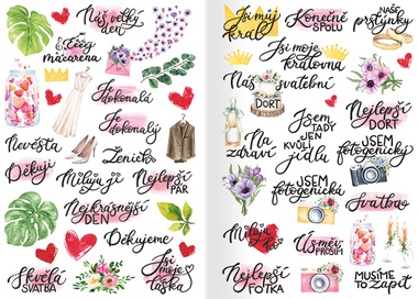 8 tematických stran samolepek se svatebními motivy a doplňky pro stylové dotvoření alba.