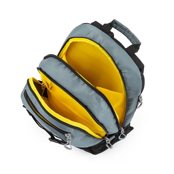 Der Rucksack besteht aus zwei Hauptfächern und einer kleineren Vordertasche, die mit starken Reißverschlüssen und praktischen Schlaufen ausgestattet ist.