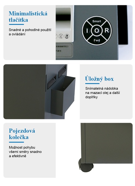 Stroj je standardně vybaven automatickým systémem start/stop, zpětným chodem, tepelnou pojistkou motoru proti přehřátí a signalizací přeplněného koše.