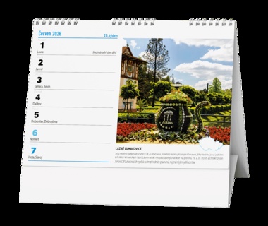 Stolní kalendář s týdenním kalendáriem s obrázky známých míst v naší zemi. Papír: G print, 100 g/m2 Obálka: křída lesk 135 g/m2 Stojánek je z kvalitní bílé lepenky 600g/m2 Dělená kovová spirála "twin wire"