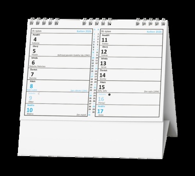 Jednoduchý a praktický pracovní kalendář se čtrnáctidenním kalendáriem v menším formátu. Papír: ofset, 70g/m2 Obálka: křída lesk 135 g/m2 Stojánek je z kvalitní bílé lepenky 600g/m2 Dělená kovová spirála "twin wire"
