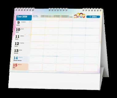 Stolní týdenní kalendář pro všechny členy rodiny. Papír: ofset, 100g/m2 Obálka: křída lesk 135 g/m2 Stojánek je z kvalitní bílé lepenky 600g/m2 Dělená kovová spirála "twin wire"