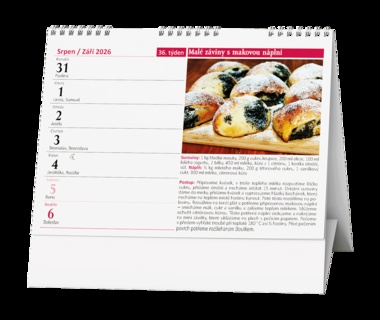 Stolní kalendář s týdenním kalendáriem a s recepty pro oblíbená sladká jídla. Papír: G print, 100 g/m2 Obálka: křída lesk 135 g/m2 Stojánek je z kvalitní bílé lepenky 600g/m2 Dělená kovová spirála "twin wire"