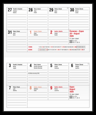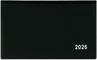 Jednoduchý a praktický týdenní diář vyrobený z jemného hladkého materiálu s polomatným povrchem černé barvy. Ideální pro každého, kdo si oblíbil měkkou šitou vazbu. jemný hladký materiál PVC, potisk roku bílou barvou, šitá vazba V1, ofset, 70g/m2