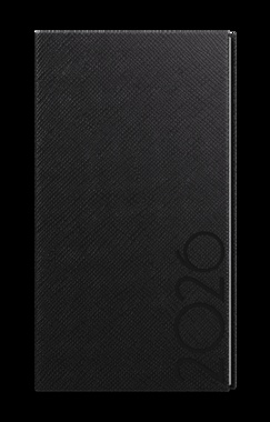 Kapesní týdenní diář v černé barvě se strukturovaným povrchem. Moderní doplněk do každé kapsy. Diář má velký prostor pro poznámky a plánování. strukturovaný materiál s lesklým povrchem, ražba roku, šitá vazba V8, stužka, perforované rožky, ofset, 70g/m2