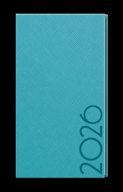 Kapesní týdenní diář v tyrkysové barvě se strukturovaným povrchem. Moderní doplněk do každé kapsy. Diář má velký prostor pro poznámky a plánování. strukturovaný materiál s lesklým povrchem, ražba roku, šitá vazba V8, stužka, perforované rožky, ofset, 70g/m2